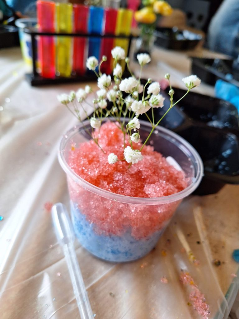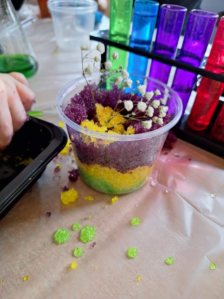 Podczas zajęć pt. „Substancja nie z tej ziemi – idealna dla kwiatów” dzieci uczestniczyły w warsztatach o charakterze eksperymentalno-przyrodniczym. W ich trakcie z pozornie prostych składników powstały niezwykłe mieszaniny o interesujących właściwościach, stanowiące wprowadzenie do świata doświadczeń. Uczestnicy przygotowali barwne roztwory, do których następnie została włożona gipsówka, obserwując proces zmiany jej koloru. Zajęcia łączyły elementy eksperymentów oraz edukacji przyrodniczej, rozwijając ciekawość poznawczą i zainteresowanie otaczającym światem. Zapraszamy do obejrzenia fotorelacji 📸
